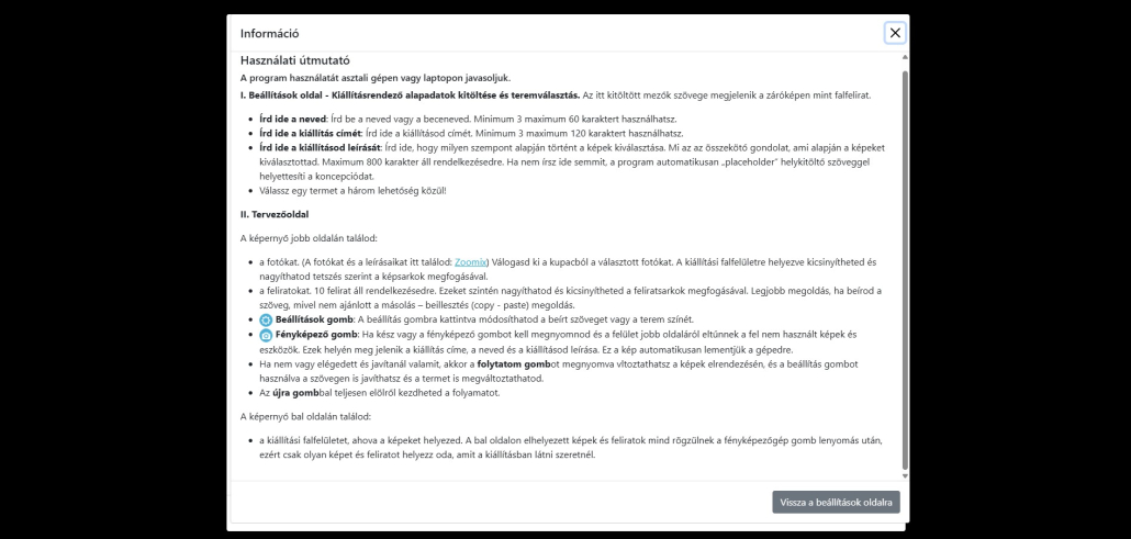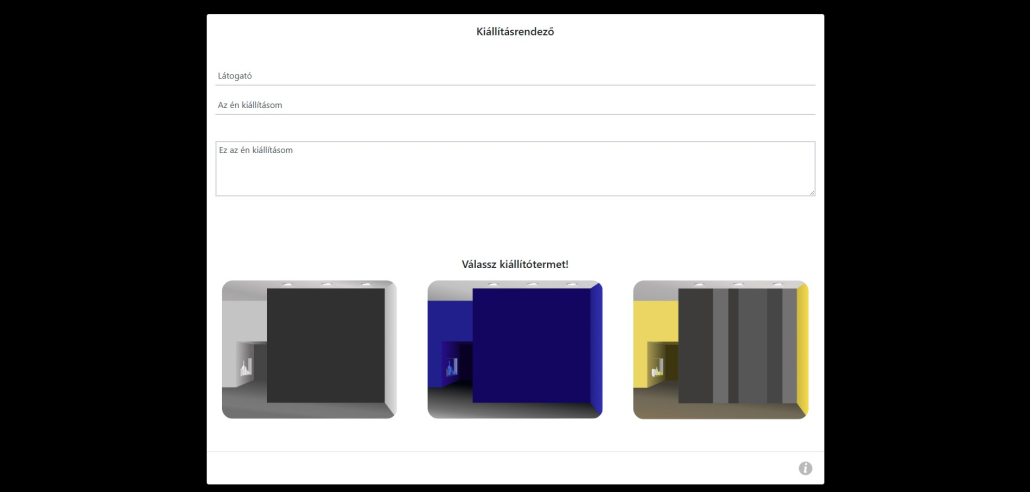 Quick how-to (Exhibition Planner): enter your name, your exhibition title and a short description, then choose a room. In the planning view, drag photographs onto the wall surface, resize and position them, and add labels. With the “camera” button you can generate the final image, and you can still refine your layout afterwards—or start over at any time.